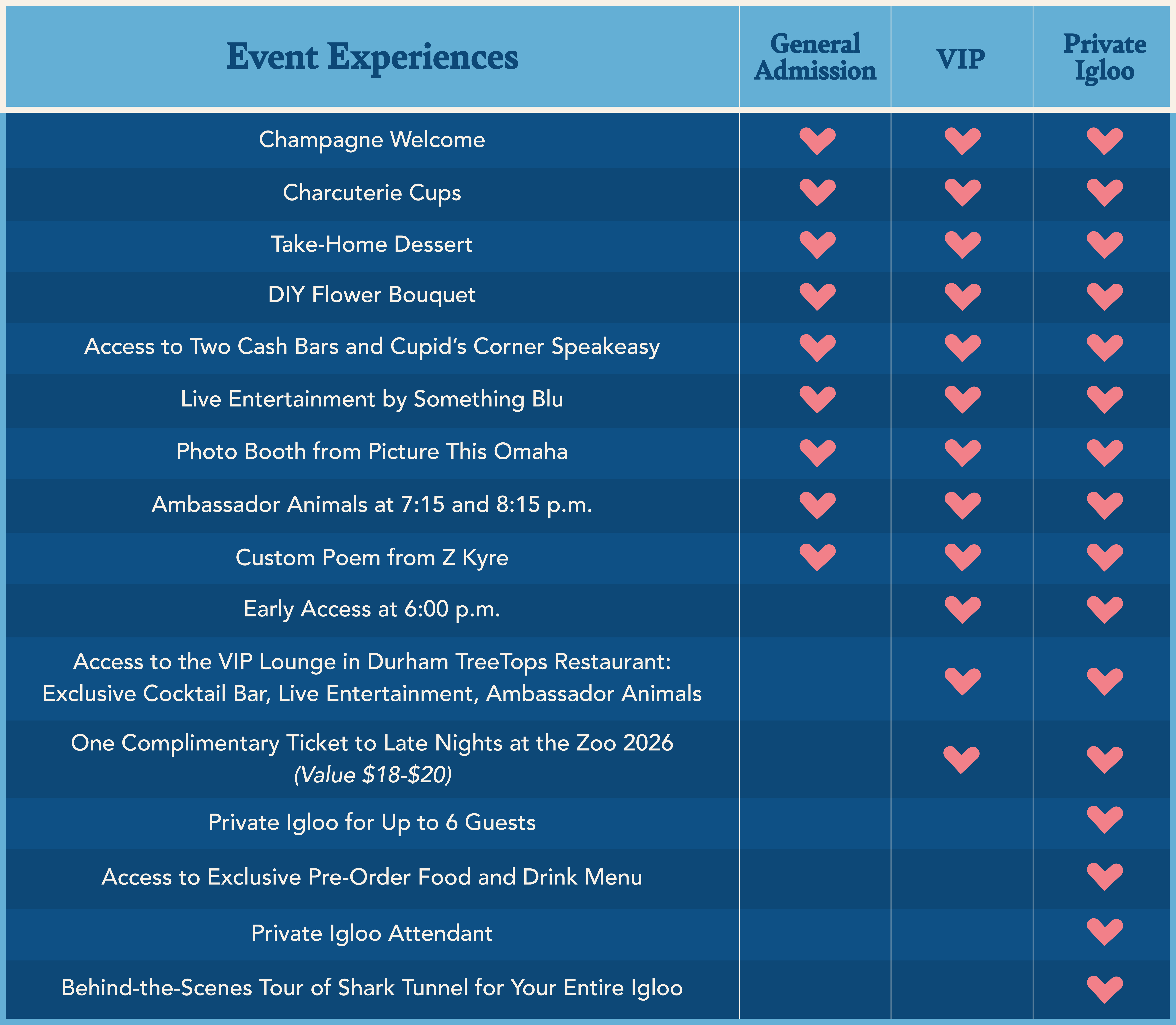 Yes, your ticket to Shark Tunnel of Love includes a charcuterie cup and a take-home dessert. VIP tickets and igloo reservations also include complimentary hors d’oeuvres provided by culinary partner Omaha Steaks served in Durham TreeTops Restaurant.